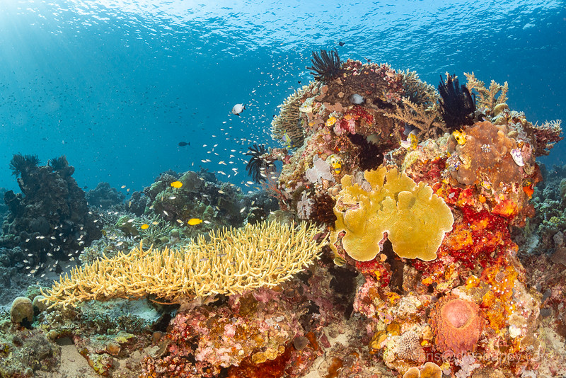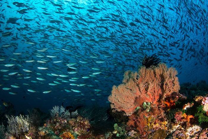 Gunung karang bawah laut dengan ikan berwarna-warni, namun arusnya kuat.