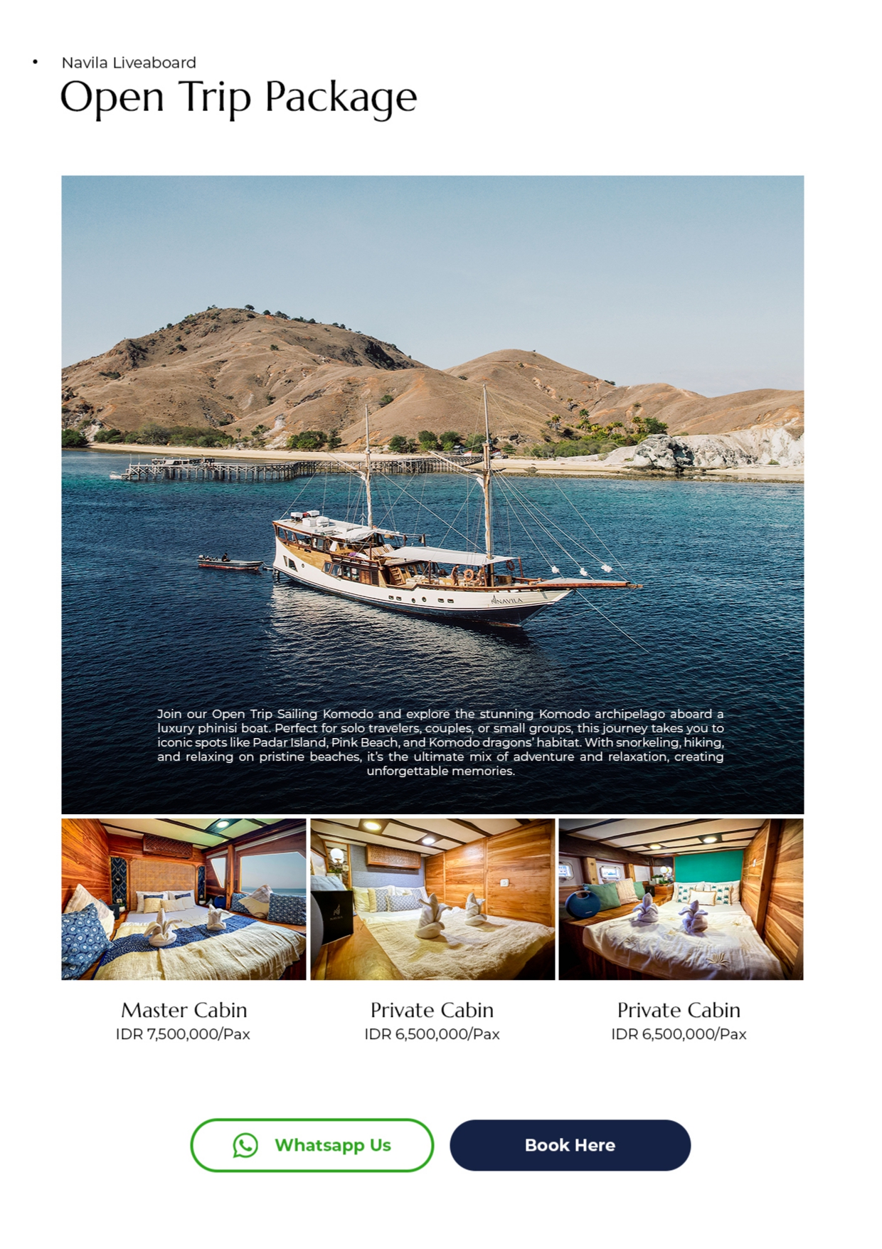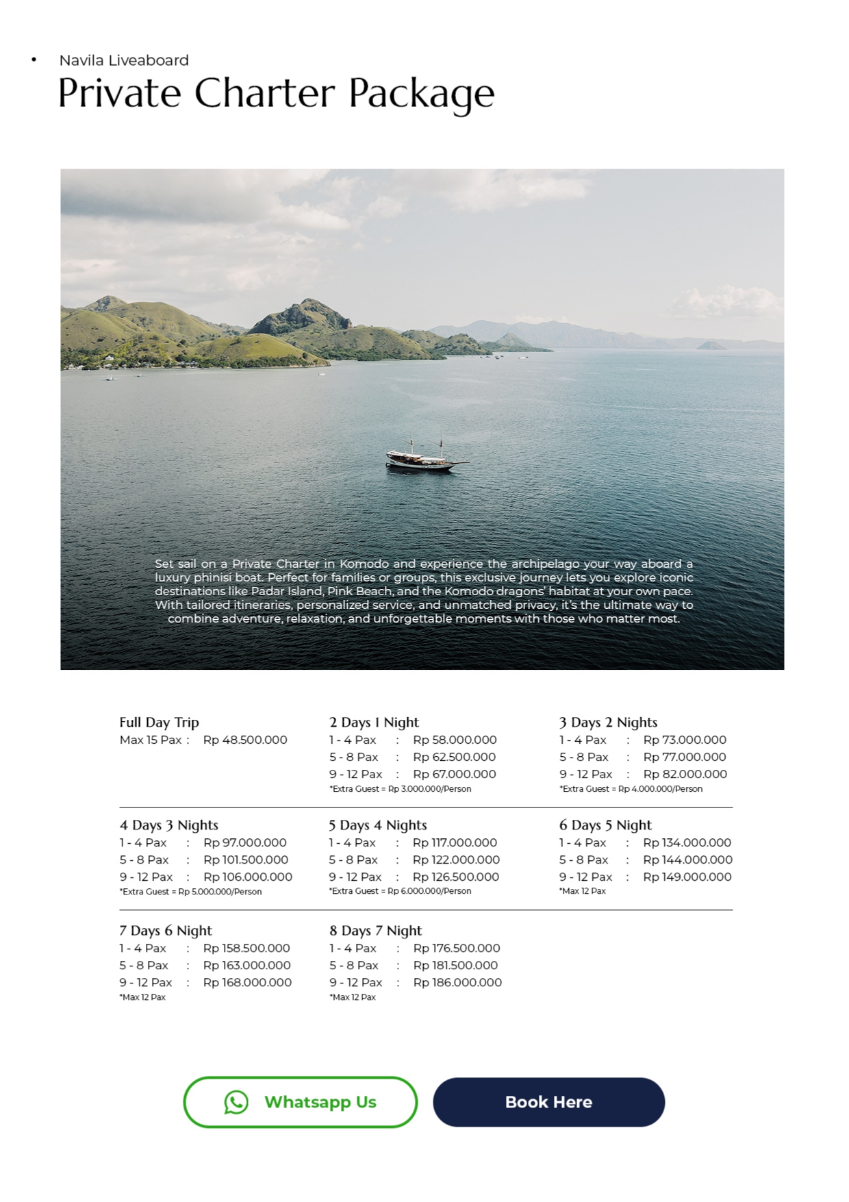 A private Phinisi trip is an exclusive boat charter where the boat is used only by you and your group. The itinerary, schedule, and activities are flexible and can be customized based on your preferences.